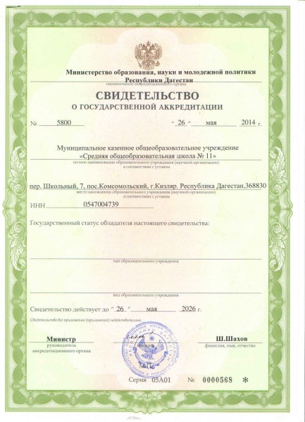 | Полное наименование образовательной организации* | Муниципальное казенное общеобразовательное учреждение "Средняя общеобразовательная школа №11 городского округа "город Кизляр" |