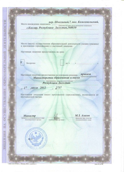 | Адрес местонахождения образовательной организации* | 368802 Республика Дагестан г. Кизляр пгт Комсомольский пер. Школьный 7 |